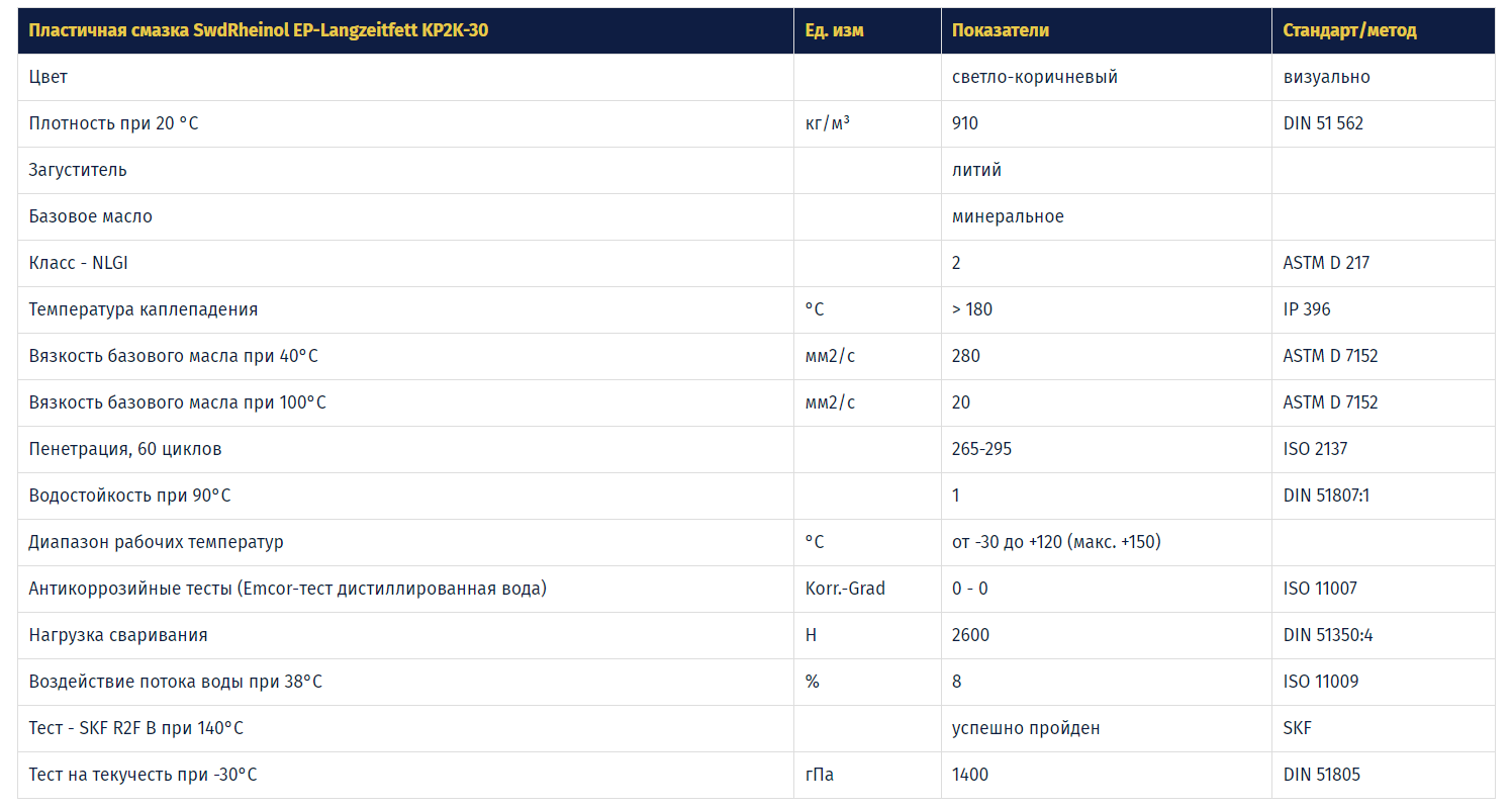 SwdRheinol EP-Langzeitfett KP2K-30 - эффективна для применения в пыльных и влажных условиях эксплуатации. Имеет хорошую механическую стабильность.