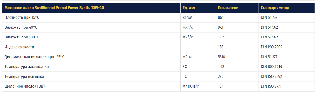 Swd Rheinol Primol Power Synth. 10W-40 - обеспечивает снижение расхода топлива и самого масла за счёт оптимально сформулированной рецептуры. Из-за широкого диапазона вязкости может использоваться всесезонно. Диспергирующие свойства данного продукта соответствуют уровню производительности масла и легко предотвращают образование отложений в контуре циркуляции масла и, таким образом, сохраняют двигатель в чистоте. Современные ингибиторные присадки увеличивает срок службы масла. Надежная защита от износа увеличивает срок службы двигателя.